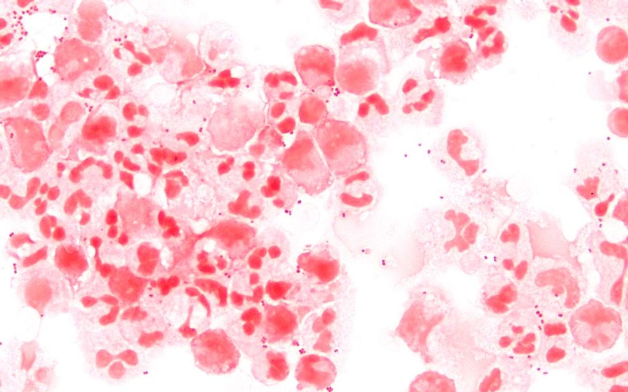 Photomicrograph of a Gram stain of spinal fluid at 1000 times magnification. Neisseria meningitidis grew from this spinal fluid. The classic Gram negative diplococci morphology is visible here. [Photo by Microman12345 – Own work / CC BY-SA 4.0]