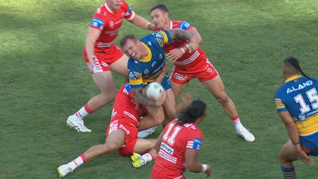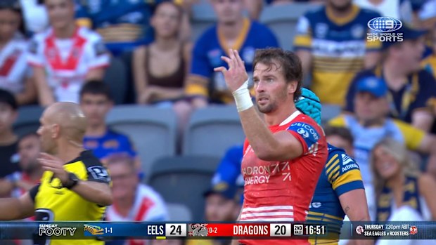 With 17 minutes left, the Dragons were on the attack and shifted from right to left as Gutherson almost broke the line before passing inside. Gutherson was spotted holding his finger and the next tackle he tried another pass that was knocked on by the Eels.