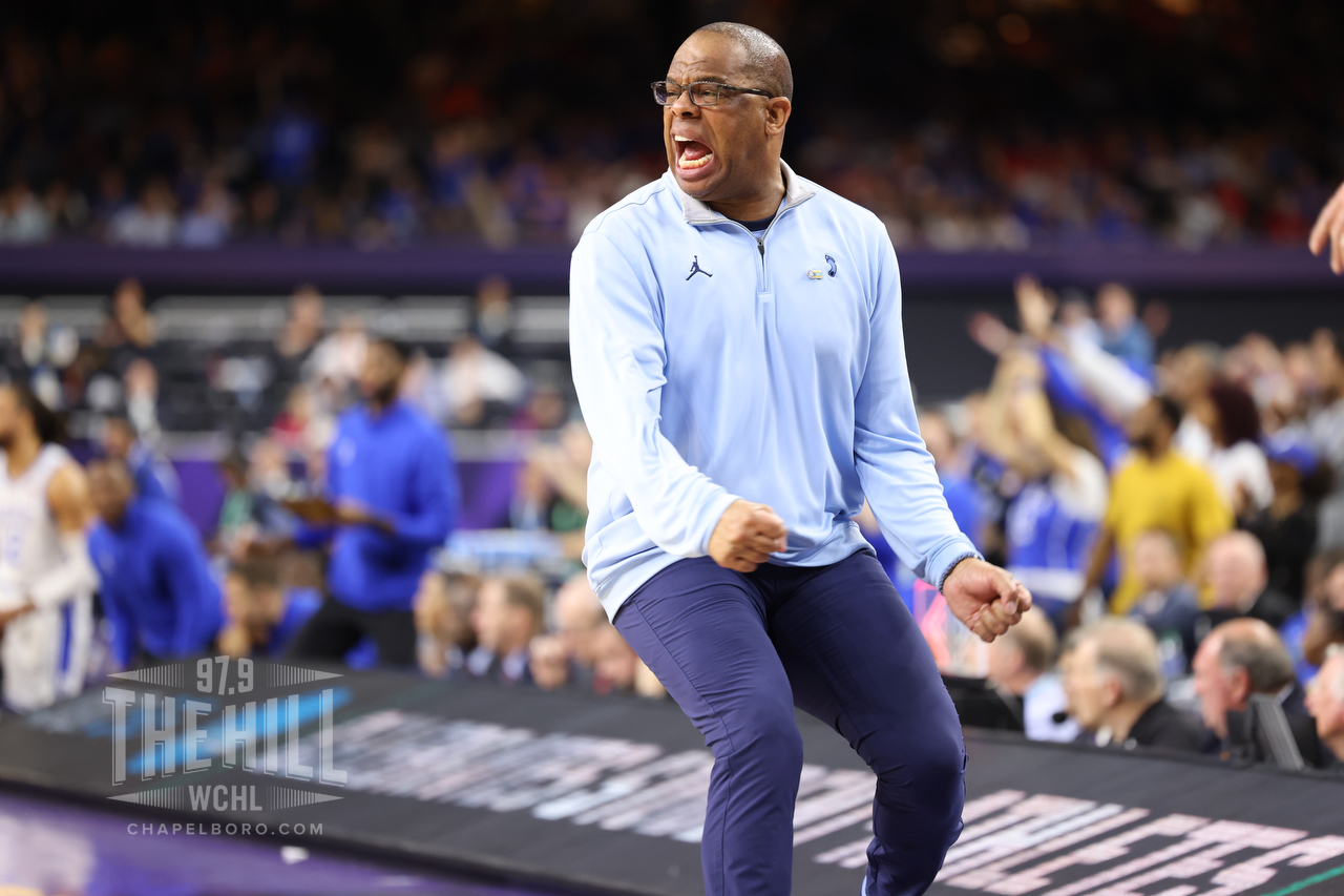 UNC head coach Hubert Davis celebrates during his men’s basketball team’s game vs. Duke in the 2022 Final Four. In the four seasons since then, Davis’ program has only made it through the first weekend of the NCAA tournament once. (Photo by Todd Melet/Chapel Hill Media Group.)