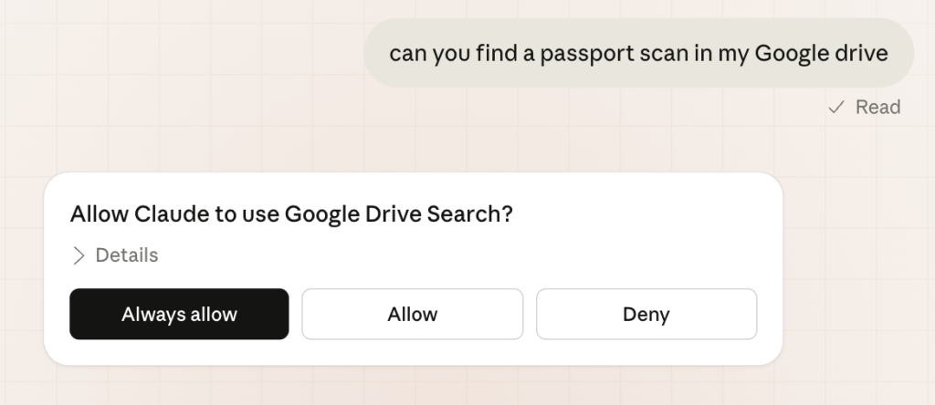 I needed to talk to Google Drive. Although Claude didn’t know it could do this, fortunately, the web did – I just had to add a connector: