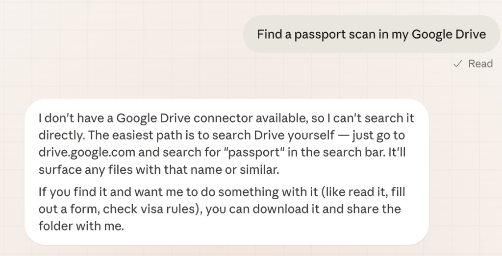 I thought I’d try to find a passport scan — which is actually something suggested in the Claude Cowork hints. I started on my laptop to check things out first: