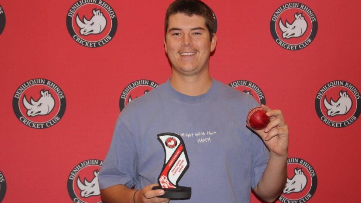 Rhinos 2025/26 A-grade bowling award winner Rory Bartlett and a fifer match ball.