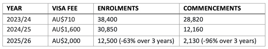 Colombian ELICOS enrolments and commencements 2023–26 as fees increased  Source: Australia Department of Education