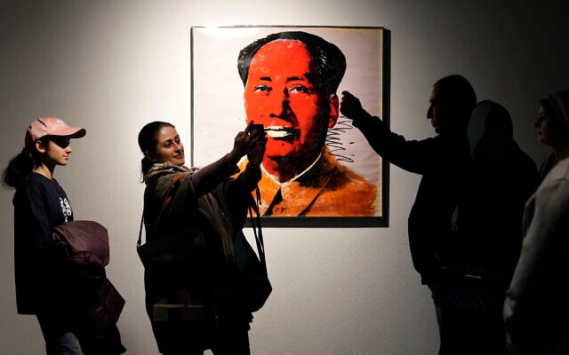 People take snapshots next to a painting of China’s late leader Mao Zedong by Andy Warhol as they visit an exhibition titled ‘Eye to Eye’ which showcases over 120 works by modern world artists as well as Iranian painters at Tehran Museum of Contemporary Art, in Tehran, November 21, 2024. (AP Photo/Vahid Salemi)
