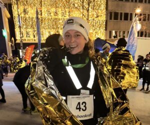 As part of her preparation, Regine Mai runs marathons and half Ironman races. Here she’s crossed the finish line after the 42.2 km Polar Night Marathon in Tromsø. Photo: Regine Mai / Instagram