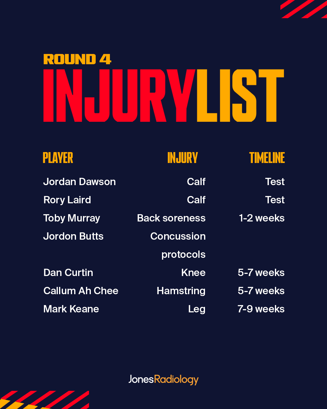 An update on Jordan Dawson, Rory Laird, Mitch Hinge and more ahead of Round Four.