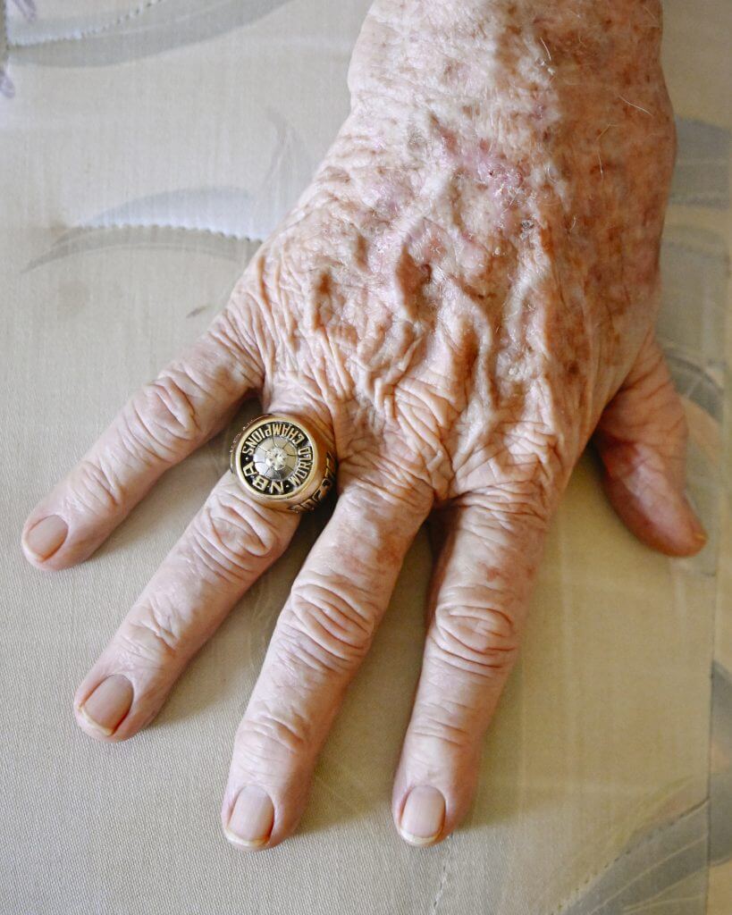 Motta shows off his 1978 NBA championship ring. Yet, he says, “My fondest memory is the Grace High School team that won the Idaho state championship.” (Alex Goodlett for The Athletic)