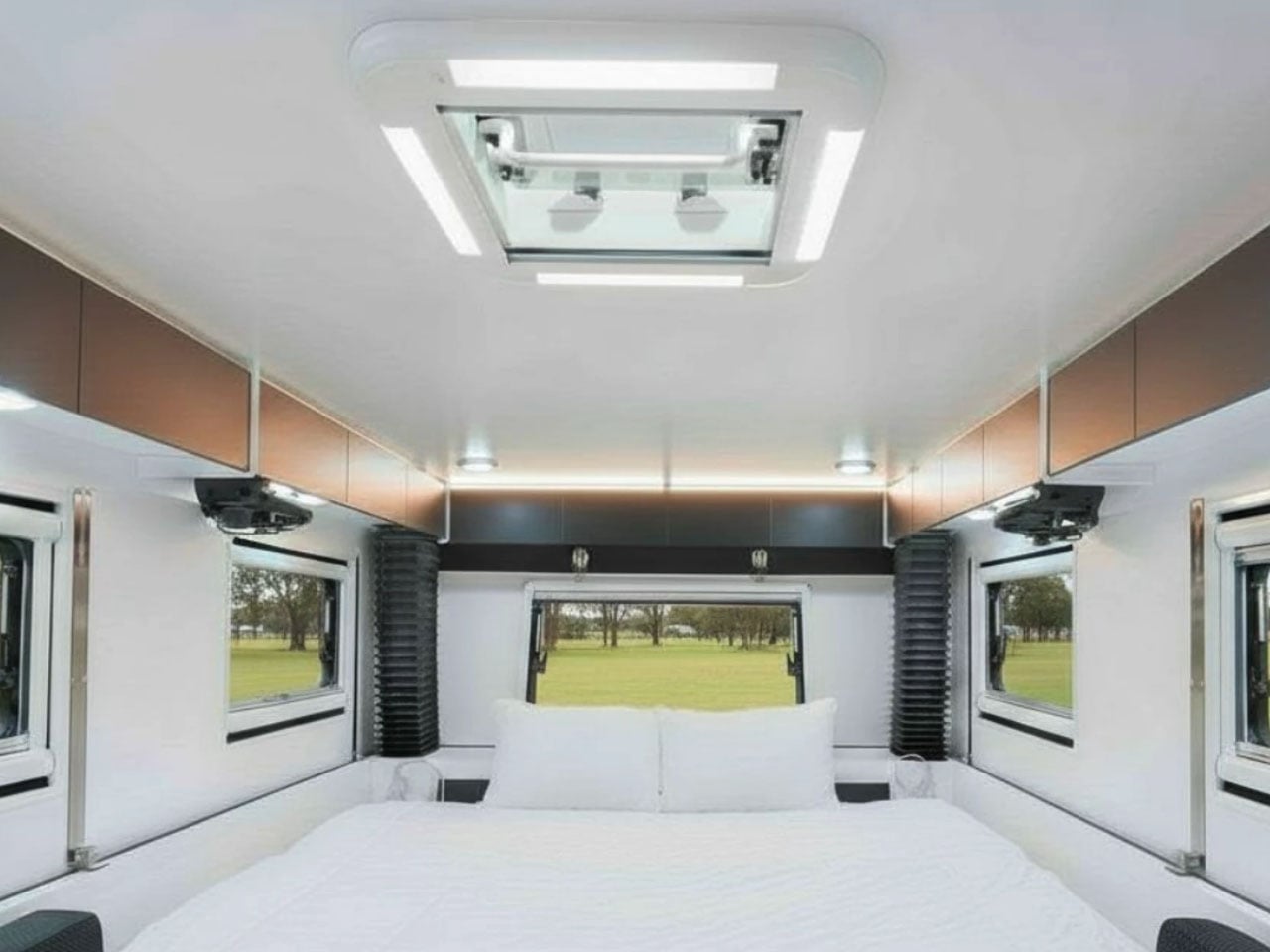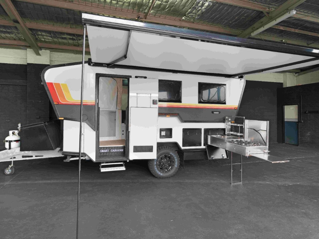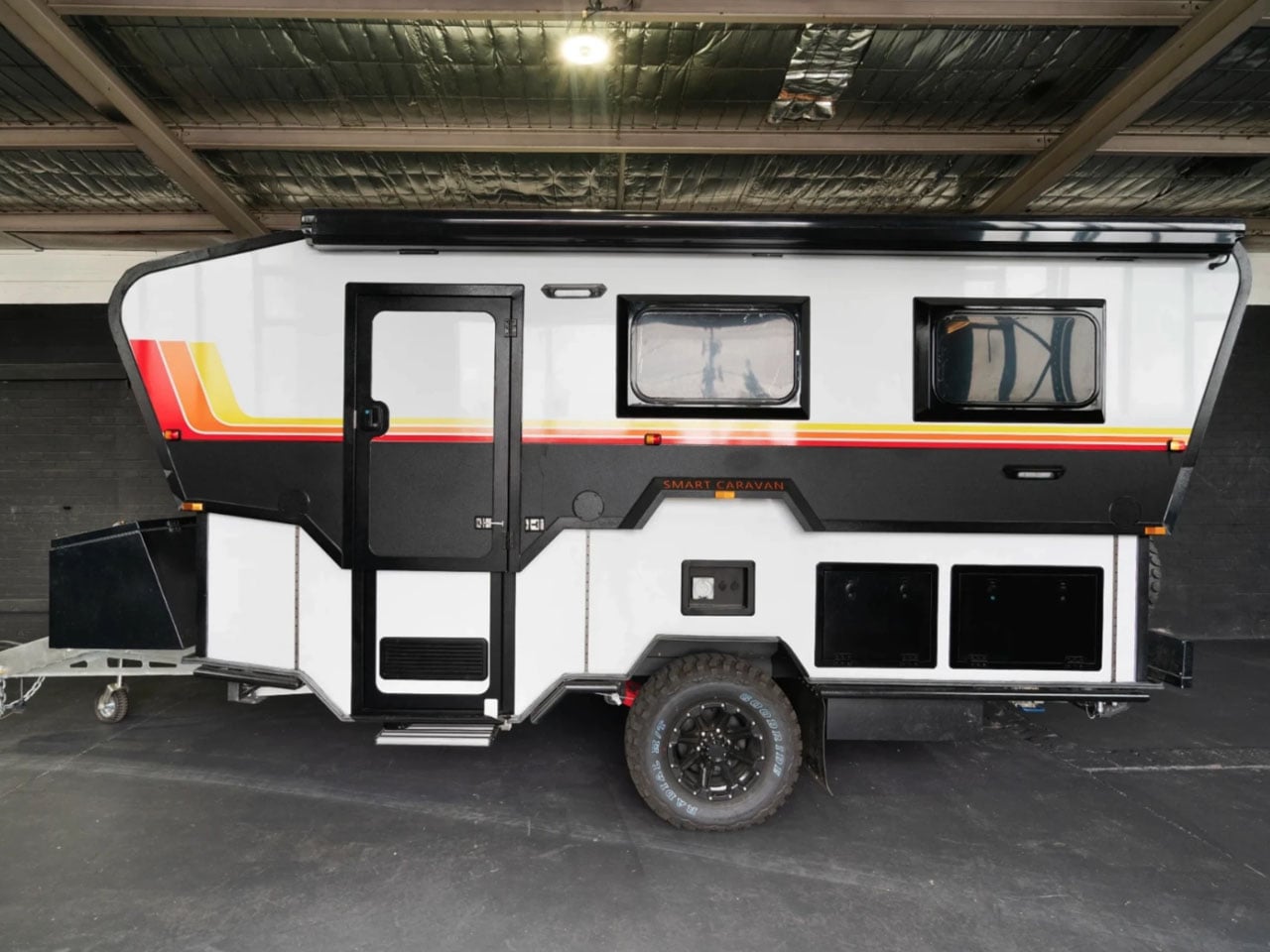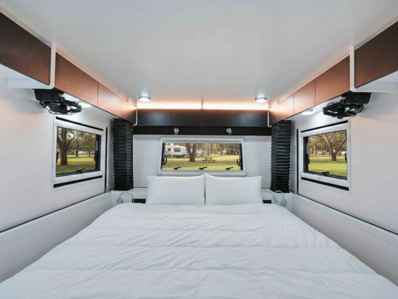 A wet bathroom with a fabric upper body that collapses when lowering the roof is an interesting part of the Low Tow, which resides next to the primary bed. The cabin, outlined with modern furnishing and interlocking cabinetry, has a double island bed with a high-density foam mattress measuring 200 cm × 150 cm. A dinette just nearby can be converted to create a second bed. Other interesting features of the new AU$79,990 (about $55,000) Low Tow include an outdoor shower and a smart TV for entertainment.