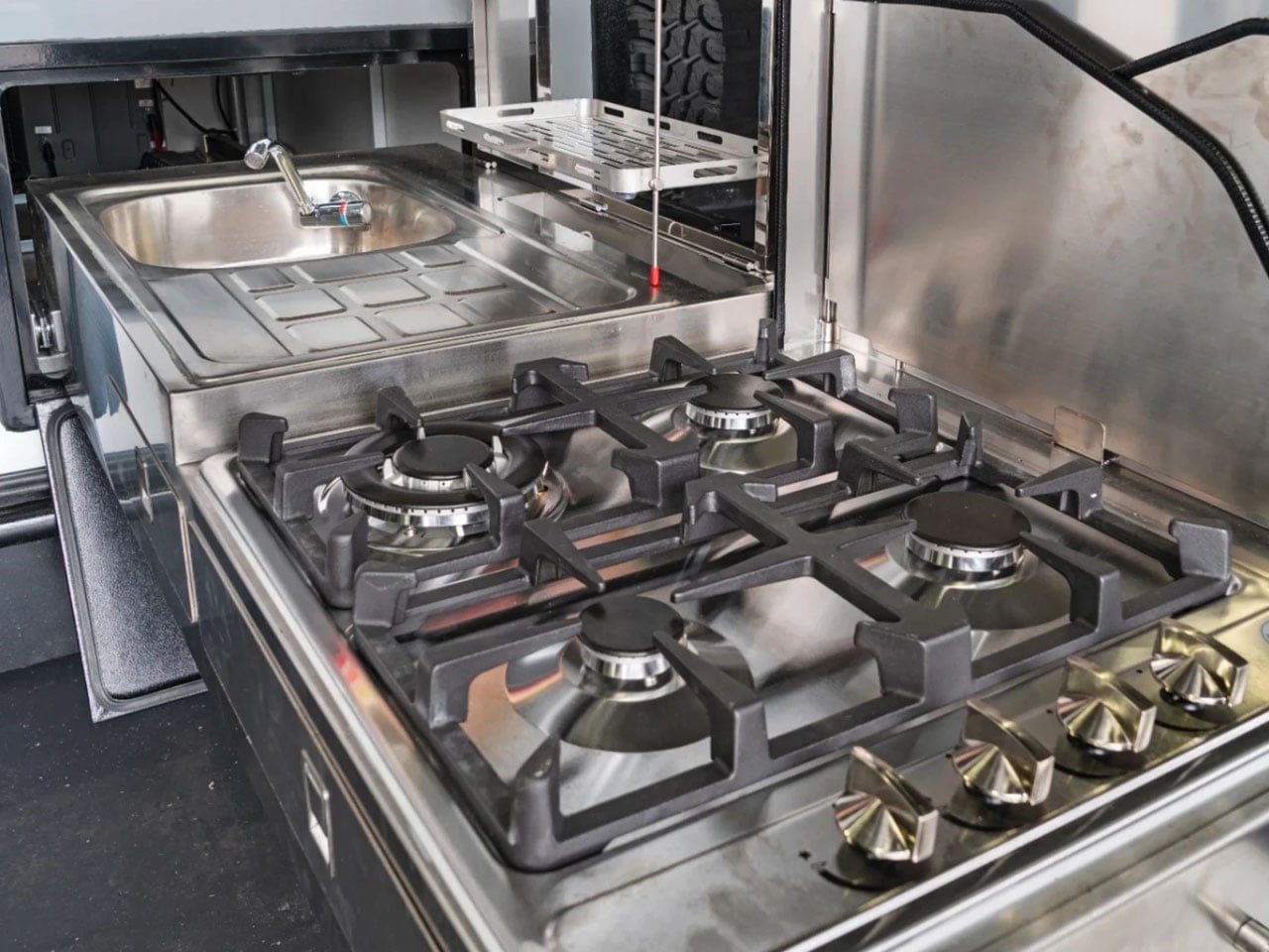 It doesn’t mean the interior is devoid of a kitchen. A little section on the inside is earmarked for the kitchen, equipped with a dual-burner induction, 12V compressor fridge, and a sink with a cover to double as a prep area. The temperature indoors is maintained by an air-conditioning and heating unit, while its 80L fresh and gray water tanks take care of the water requirements. Power needs are handled by a 600Ah LFP battery powered by a 600W solar panel and a 2,000W inverter.