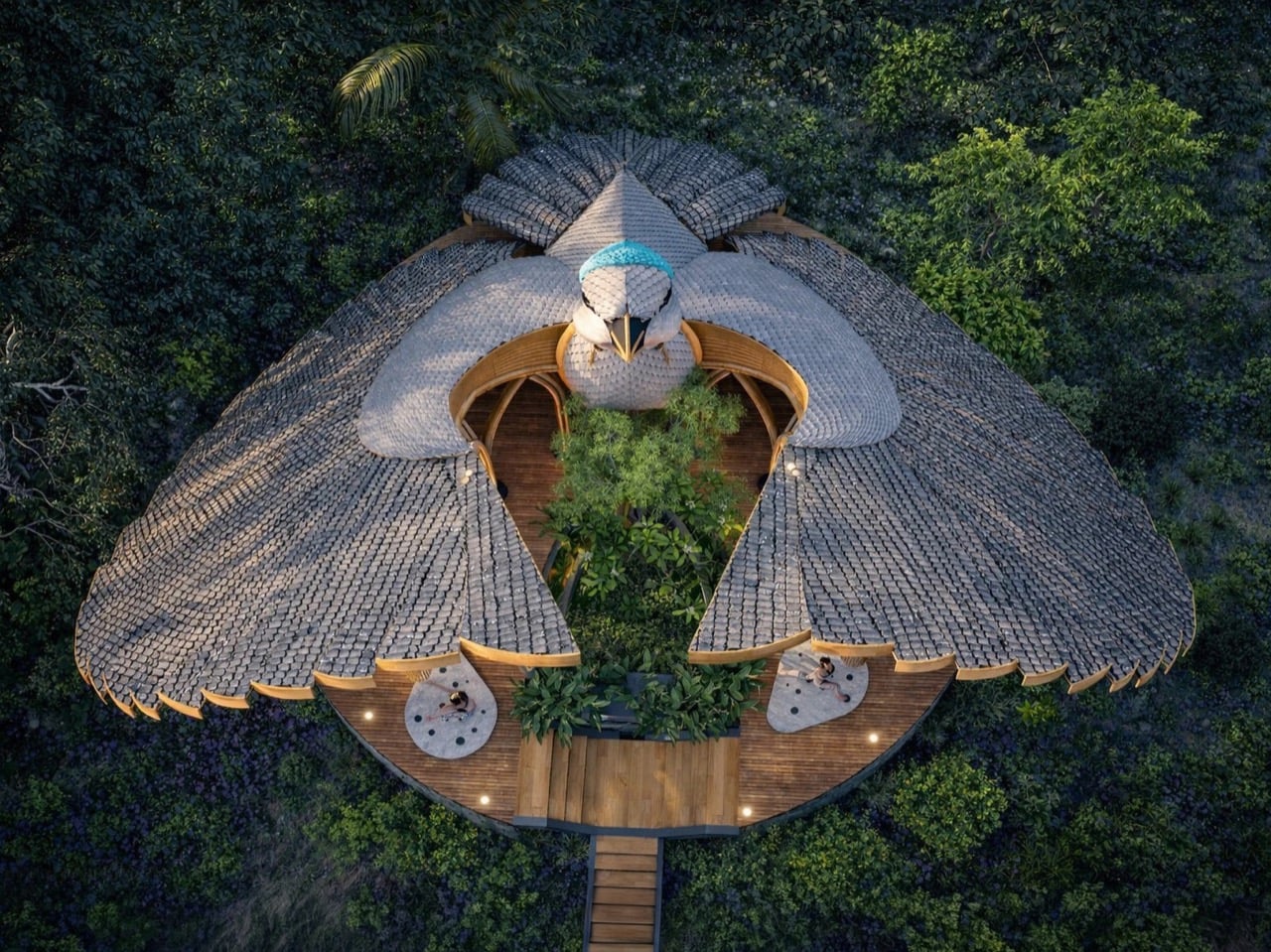 Liyanage has been doing this for years now. We’ve covered his manta ray yacht club, his deer observation deck for Yala National Park, his moose-head viewing platform in Alaska, his orchid-shaped villa, and most recently his rhino safari deck at Kifaru Point. The pattern is consistent: he finds an animal or plant with a visually distinctive form, usually something mid-gesture or mid-bloom, and translates that exact shape into a functional building using bamboo and timber. What separates this from novelty architecture is how seriously he treats the biomimicry. The proportions stay true. The radial geometry of the riflebird’s fanned wings translates directly into the roof structure here, with individual bamboo ribs following the same outward-spreading pattern you’d see in the actual feathers. The canopies tilt at the same angle the bird holds its wings during display, roughly 60 degrees from vertical based on the renders. Each layered section of the roof mimics a cluster of feathers, creating a texture that catches light the way the bird’s plumage would in dappled forest sunlight.