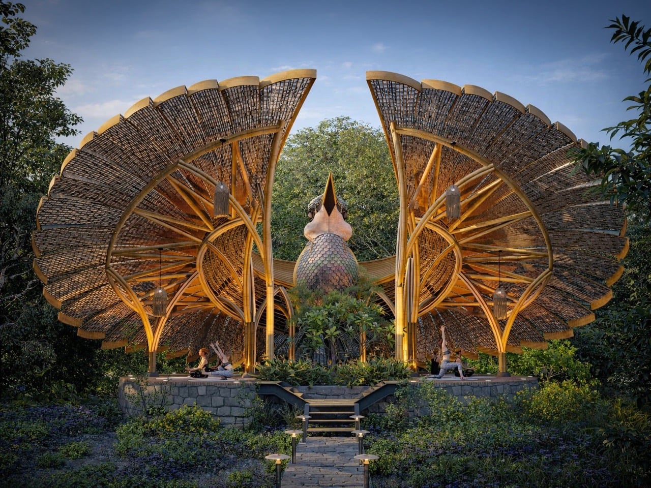 The central element between the two wing canopies reads as the bird’s body and head, complete with what looks like a sculptural interpretation of the throat and beak pointing skyward. It’s a bold move because it commits fully to the metaphor instead of softening it. You’re looking at a building shaped like a bird in the middle of a courtship display, and Liyanage doesn’t hedge. The yoga platform sits at the base on a raised stone deck accessed by stairs, giving practitioners an elevated view of the surrounding forest. The structure appears to be around 15 feet tall at the wing peaks based on the human figures in the renders, which puts it at a scale that’s monumental without being absurd. A real Victoria’s riflebird measures about 24 centimeters. This version scales that gesture up roughly 20 times while keeping the anatomical relationships intact.