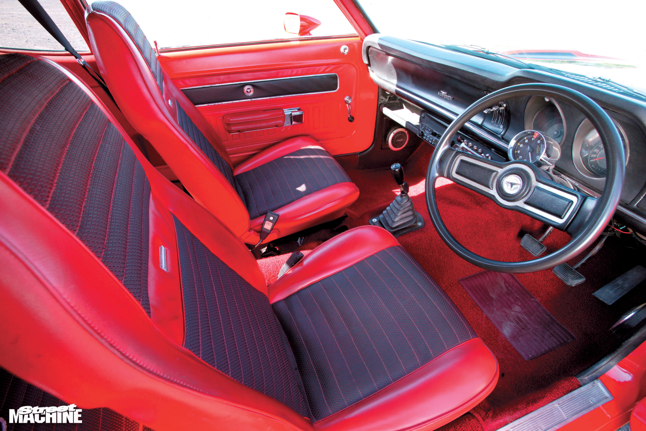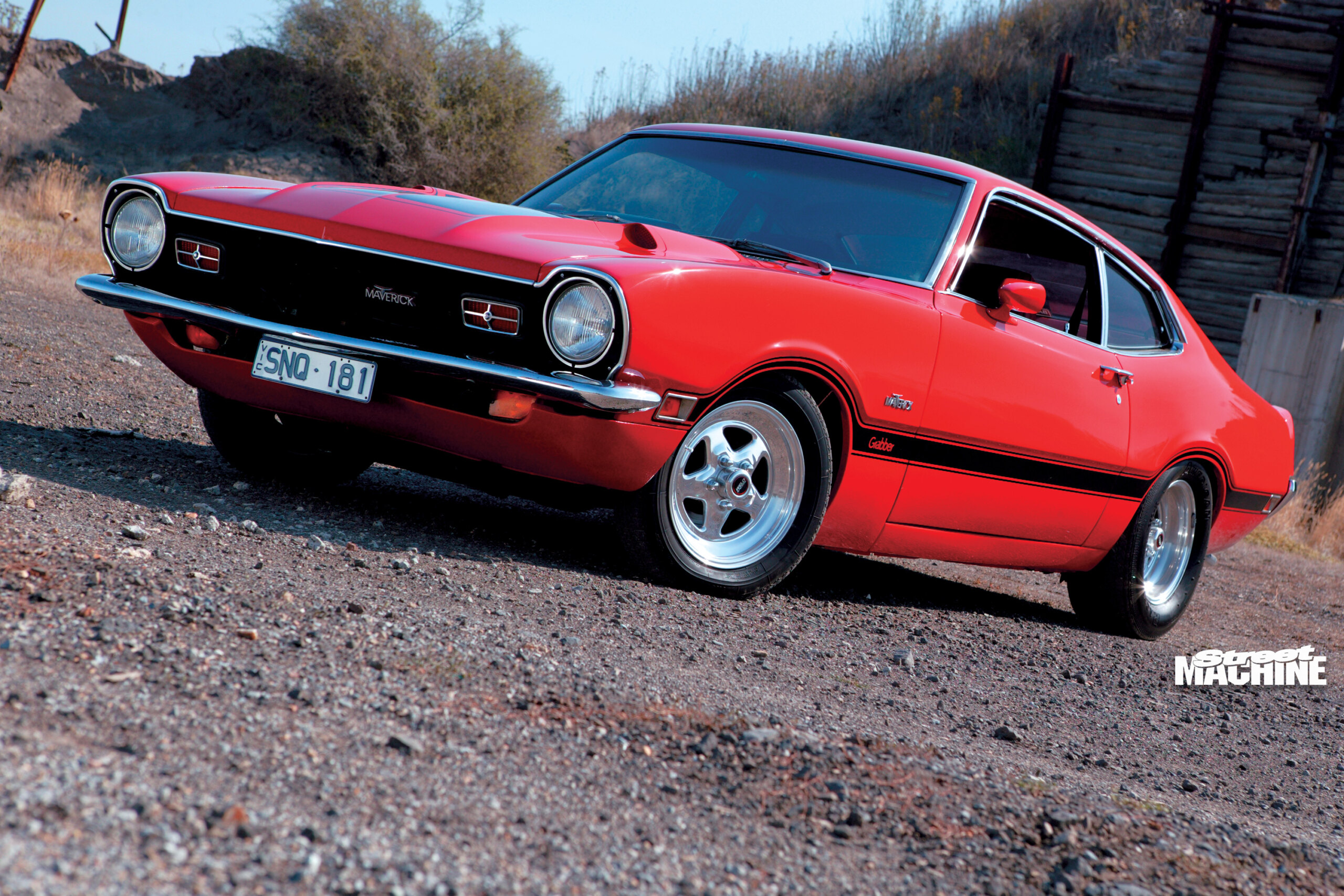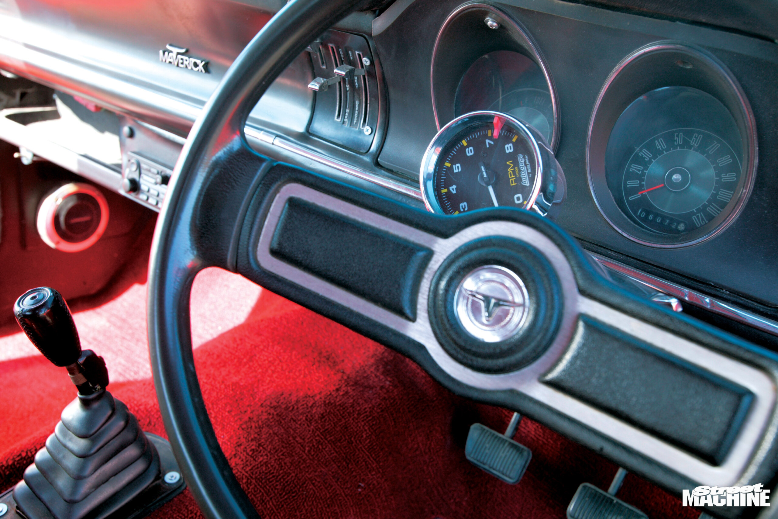 1972 Ford Maverick GrabberColour:Orange FlameGRUNTType:302ci Windsor V8Heads:StockCam:Crane Fireball hydraulicCarb:Holley 650 four-barrelDRIVETrans:Four-speed top loaderDiff:Nine-inchGRIPSuspension:Standard height (coils and leaves)Shocks:Koni adjustableBrakes:XA discs & calipers (f), stock drums (r)Steering:Recirculating ballINTERIORSeats:StockTrim:Recovered in red vinylSounds:PioneerROLLING STOCKWheels:Pro Star alloys, 15×3.5 (f), 15×8 (r)Rubber:Michelin XZX (f), American Racing G60 (r)