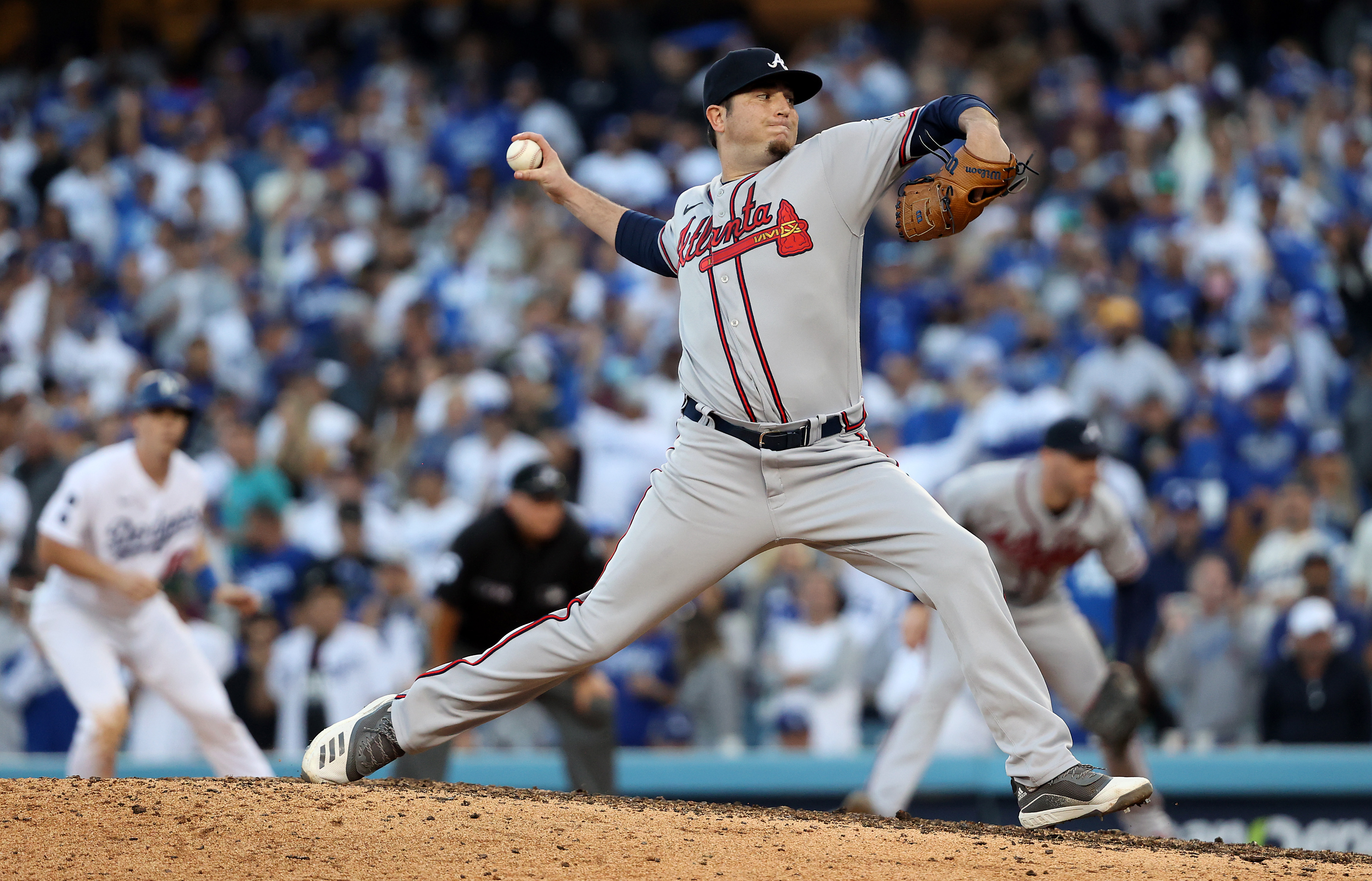 GettyLuke Jackson #77 of the Atlanta Braves pitches during the 8th inning of Game 3 of the National League Championship Series against the Los Angeles Dodgers at Dodger Stadium on October 19, 2021 in Los Angeles, California.
