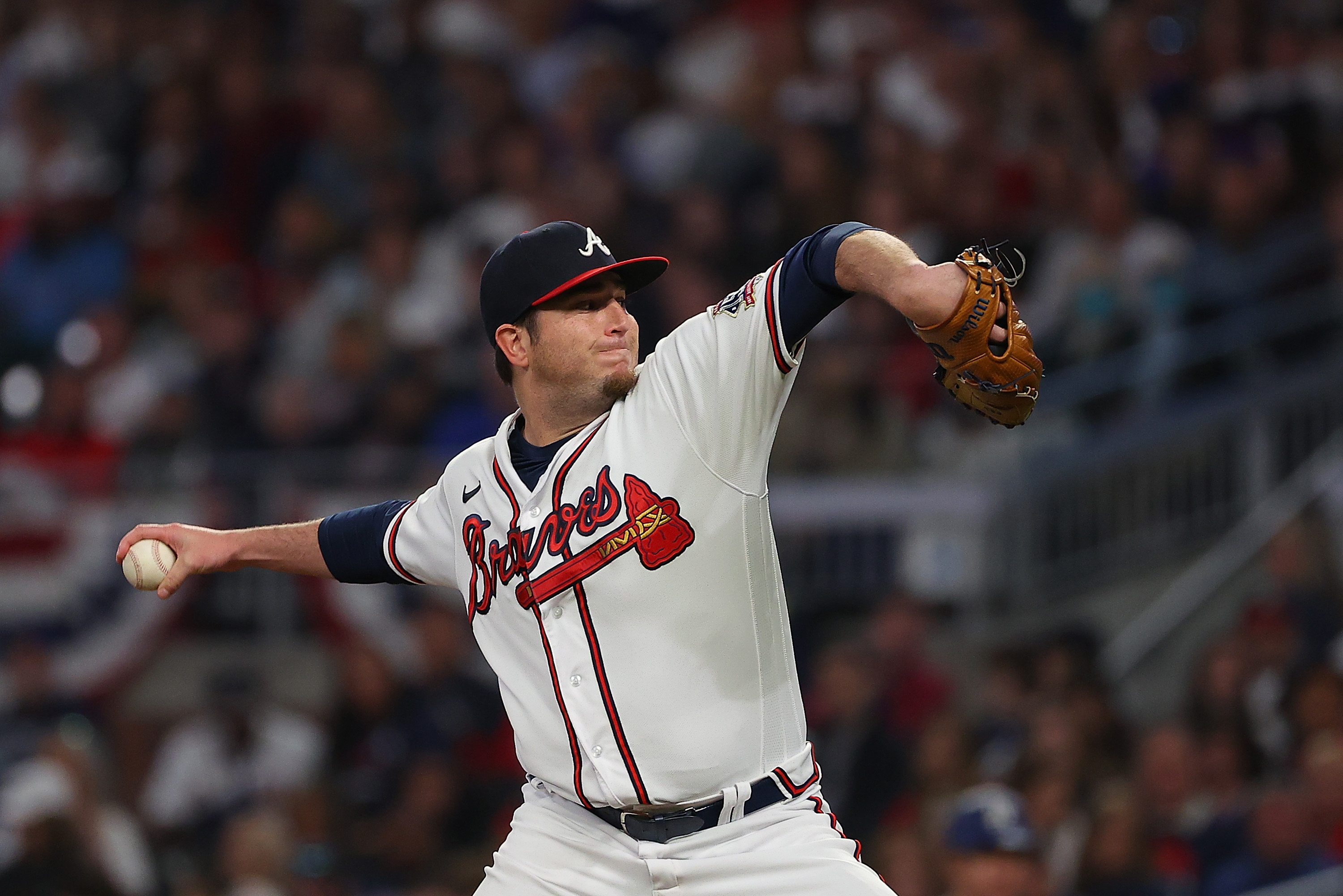 GettyLuke Jackson #77 of the Atlanta Braves throws a pitch during the seventh inning of Game Six of the National League Championship Series against the Los Angeles Dodgers at Truist Park on October 23, 2021 in Atlanta, Georgia.