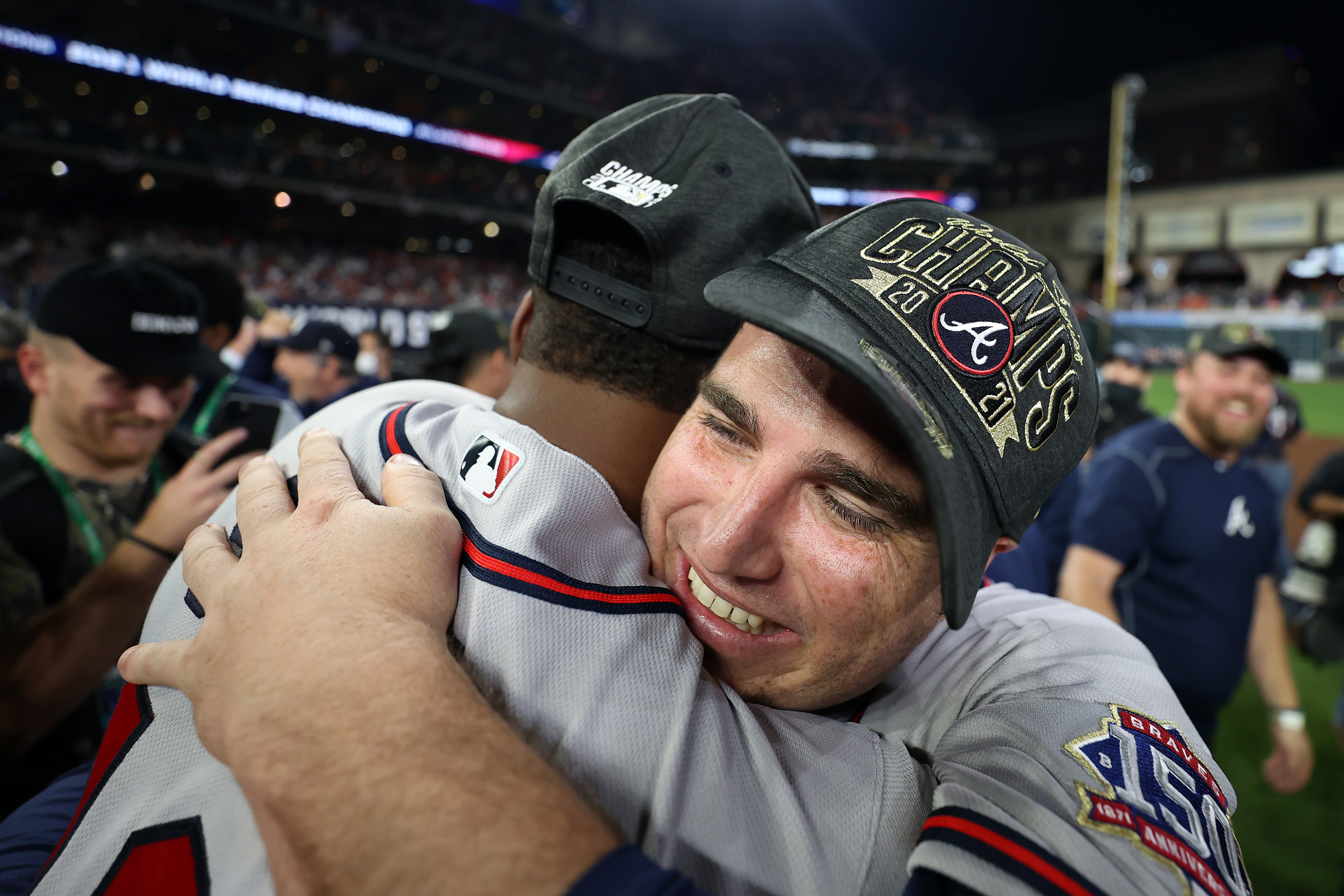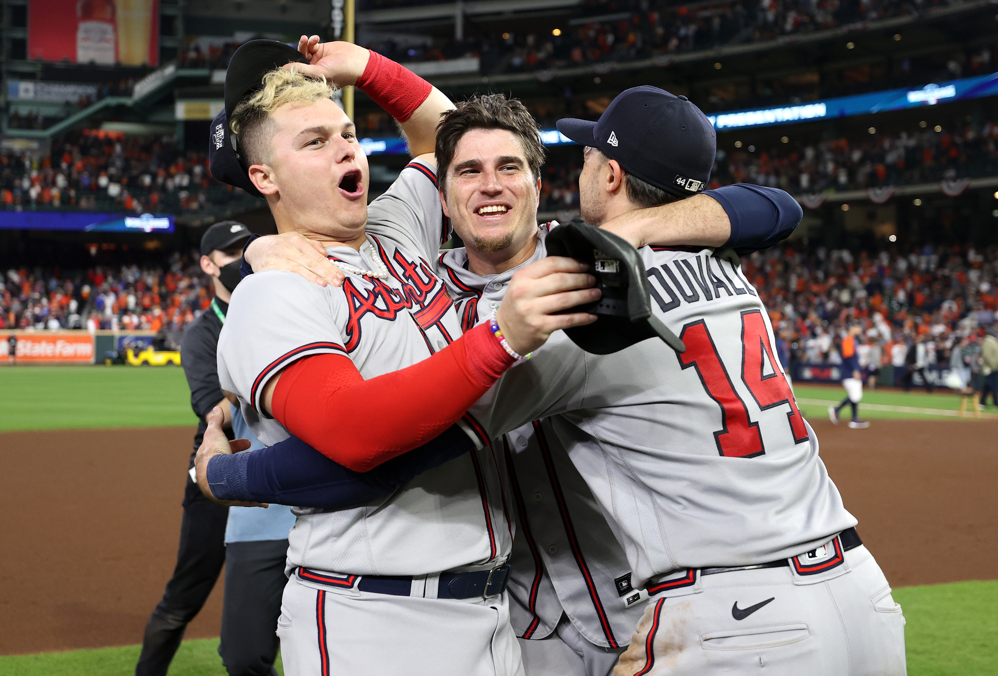 GettyJoc Pederson #22, Luke Jackson #77, and Adam Duvall #14 of the Atlanta Braves celebrate on the field after defeating the Houston Astros 7-0 in Game Six of the World Series at Minute Maid Park on November 02, 2021 in Houston, Texas.