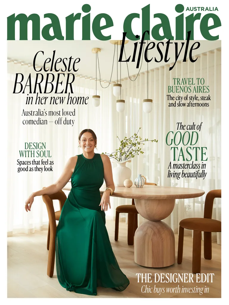 In the elegant dining room, the full spectrum of Celeste’s colour palette is on display. Cinnamon chairs from Fenton & Fenton complement the custom dining table by Le Serve in Tasmanian oak, and a dramatic pendant by Smith & Smith hangs above. Sheer curtains from DIY Blinds diffuse the natural light. Photographer: Julie Adams. Stylist: Emily Gittany. Hair and makeup: Ashlea Penfold. Creative direction: Rebecca Rhodes. Production: Robyn Fay-Perkins.