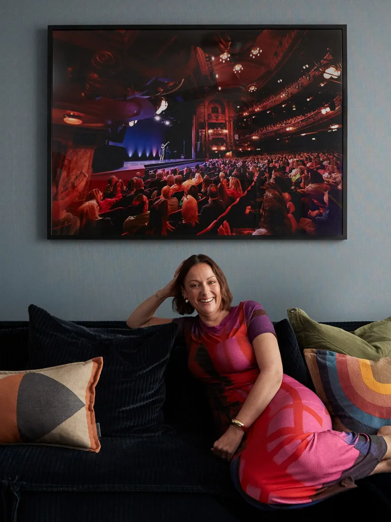 A large, custom-made Harbro sofa in navy corduroy is filled with colourful cushions from Pony Rider. The custom print, by Fine Print Co, captures a favourite moment onstage in London, during Celeste’s tour. Photographer: Julie Adams. Stylist: Emily Gittany. Hair and makeup: Ashlea Penfold.Creative direction: Rebecca Rhodes. Production: Robyn Fay-Perkins.