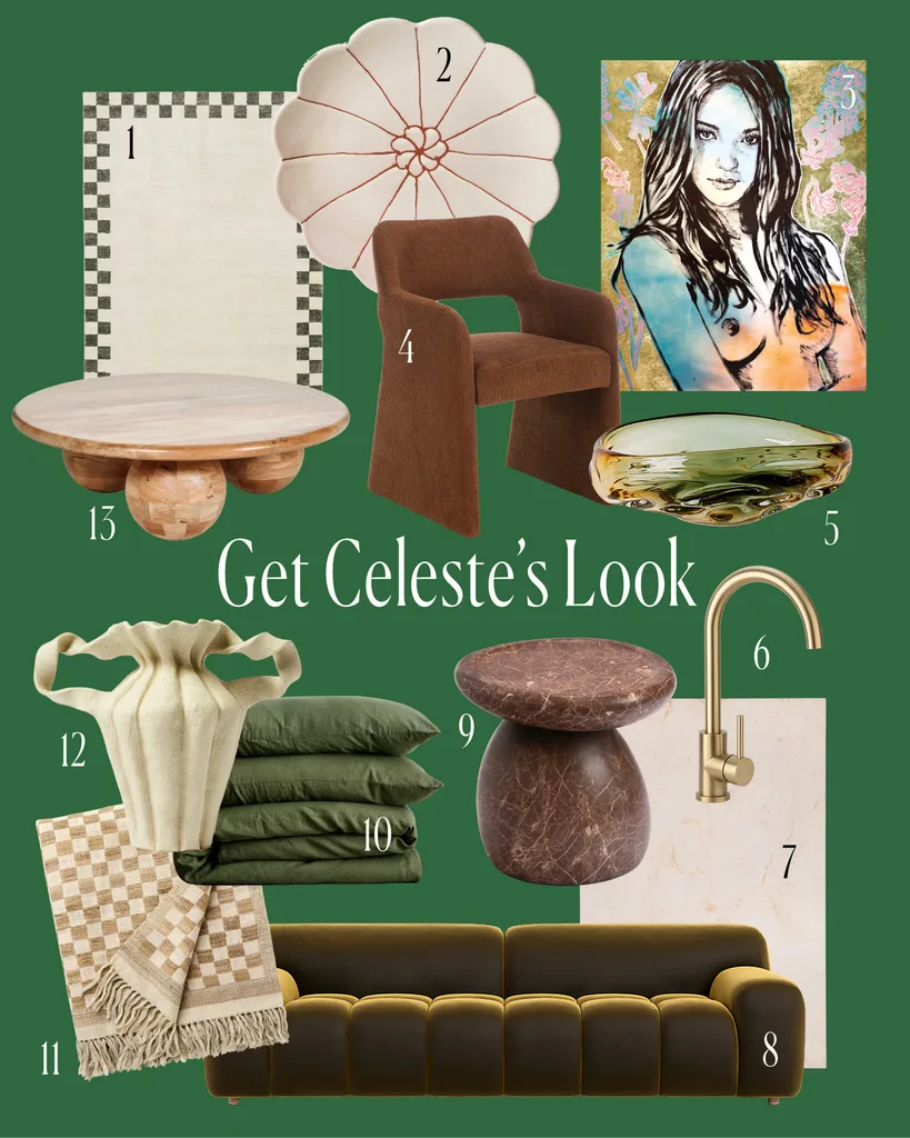 1 Miss Amara rug. 2 Robert Gordon plate. 3 Play a Simple Melody print by David Bromley from FinePrintCo. 4 Life Interiors dining chair. 5 Elme Living bowl from Freedom. 6 ABI Interiors kitchen mixer. 7 floor tile. 8 Freedom 3-seater sofa. 9 Life Interiors side table. 10 Cultiver quilt cover and pillowcases. 11 L&M Home throw. 12 Merci Maison vase. 13 Temple & Webster coffee table.