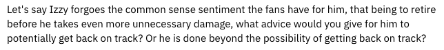 Let’s say Izzy forgoes the common sense sentiment the fans have for him, that being to retire before he takes even more unnecessary damage, what advice would you give for him to potentially get back on track? Or he is done beyond the possibility of getting back on track?