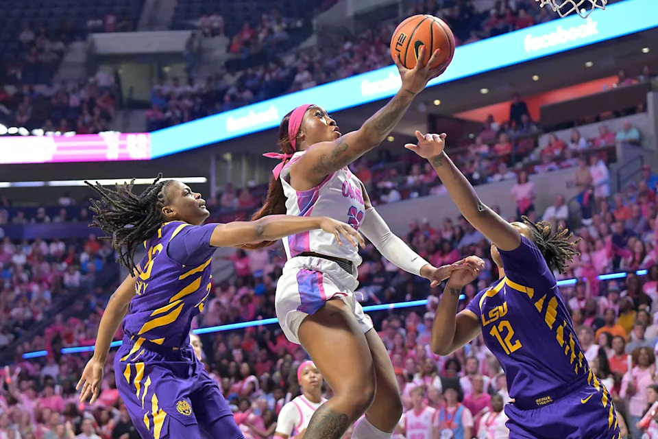 Ole Miss forward Cotie McMahon (32) scores between LSU’s MiLaysia Fulwiley (23) and LSU’s Mikaylah Williams (12) in a NCAA women’s college basketball game at the Sandy and John Black Pavilion at Ole Miss in Oxford, Miss. on Thursday, Feb. 19, 2026.