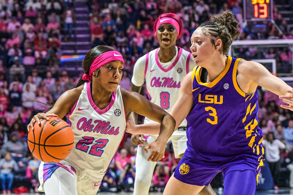 Ole Miss guard Denim DeShields (22) is defended by LSU’s Bella Hines (3) in a NCAA women’s college basketball game at the Sandy and John Black Pavilion at Ole Miss in Oxford, Miss. on Thursday, Feb. 19, 2026.