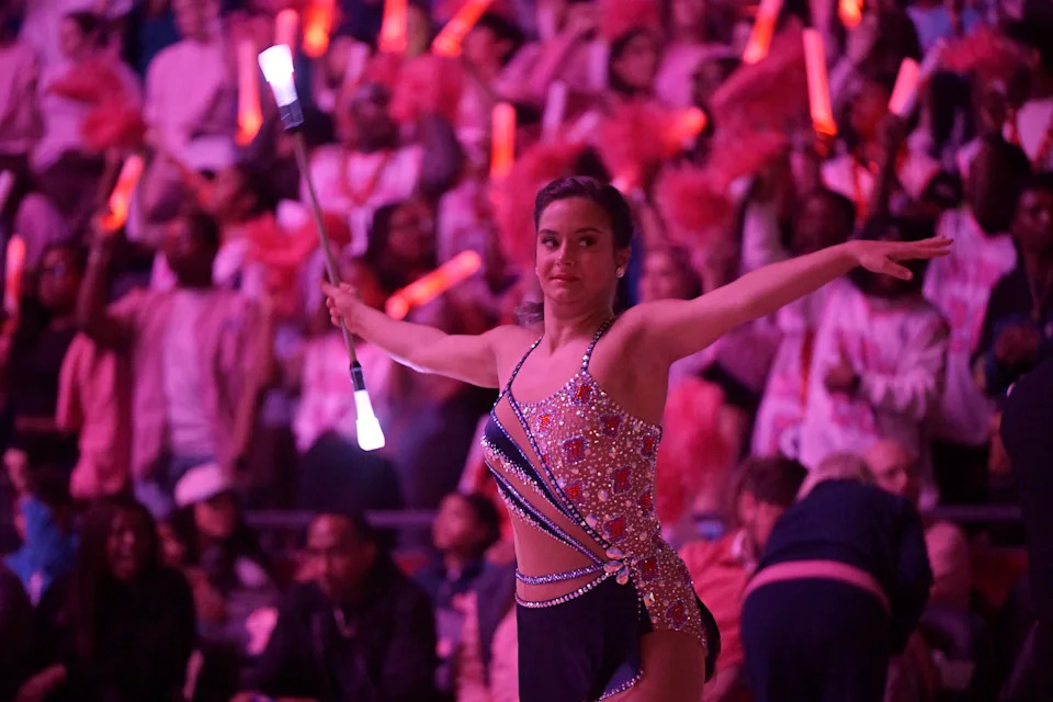 A baton twirler performs at Ole Miss vs. LSU in a NCAA women’s college basketball game at the Sandy and John Black Pavilion at Ole Miss in Oxford, Miss. on Thursday, Feb. 19, 2026.