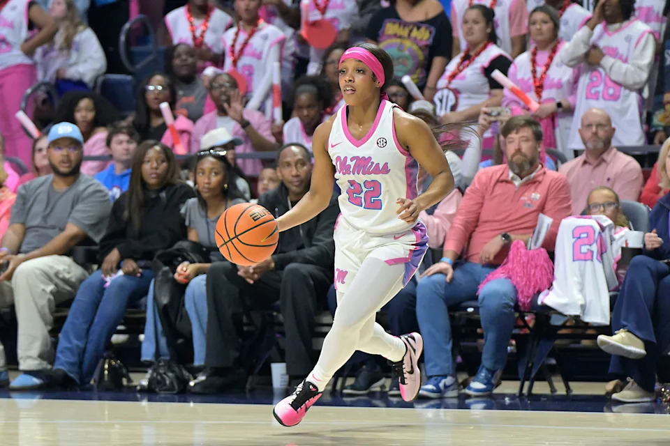 Ole Miss guard Denim DeShields (22) dribbles vs. LSU in a NCAA women’s college basketball game at the Sandy and John Black Pavilion at Ole Miss in Oxford, Miss. on Thursday, Feb. 19, 2026.