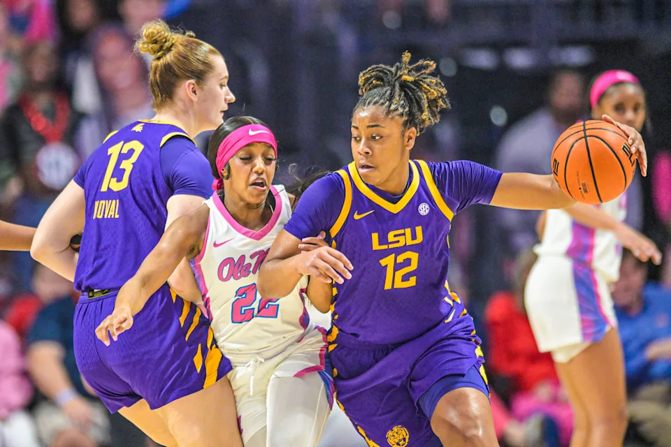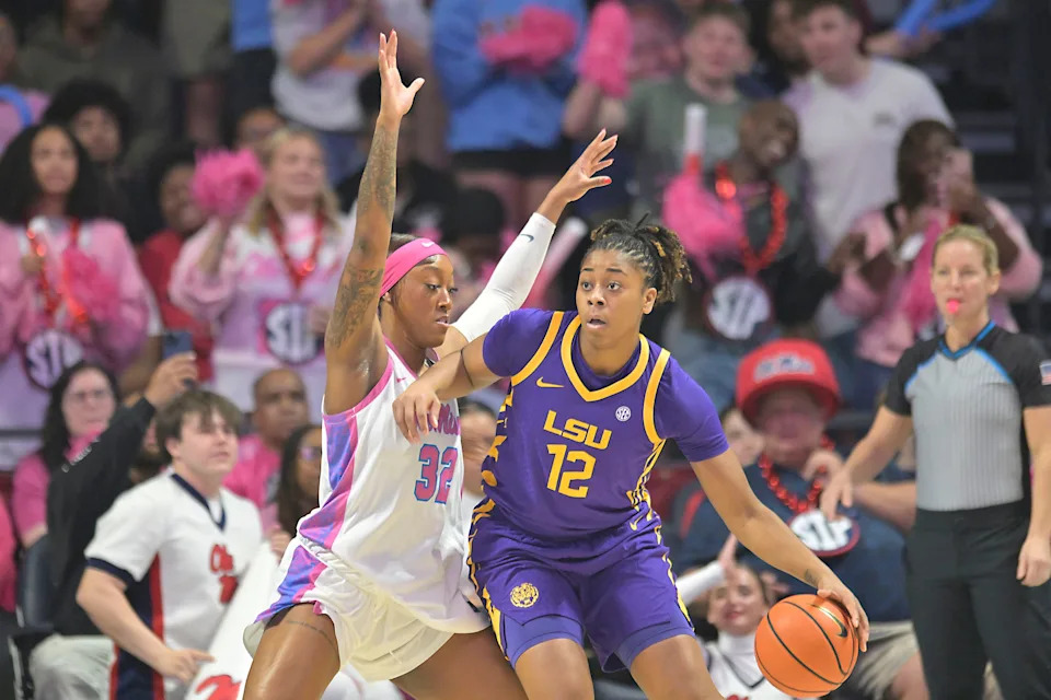 LSU’s Mikaylah Williams (12) is defended by Ole Miss forward Cotie McMahon (32) in a NCAA women’s college basketball game at the Sandy and John Black Pavilion at Ole Miss in Oxford, Miss. on Thursday, Feb. 19, 2026.