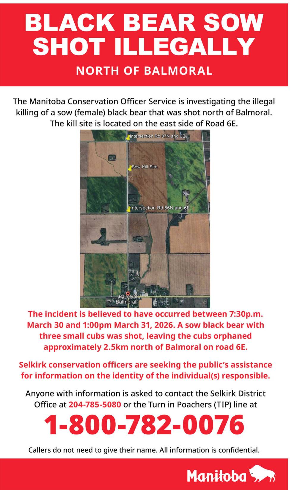 Manitoba Conservation released a poster asking anyone with information about the shooting to call Selkirk conservation officers. The shooting is believed to have happened between 7:30 p.m., MondayMarch 30and 1 p.m., TuesdayMarch 31. The bear’s body was located on the east side of Road 6E, a few kilometres north of Balmoral.