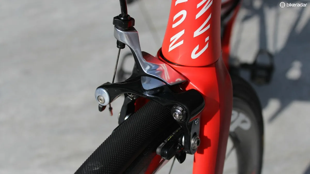 Kristoff’s Aeroad was configured for direct-mount rim brakes, a product that SRAM didn’t sell at the time, so his calipers were Shimano with the logos scrubbed out. They were fitted with SwissStop brake pads and brake cables ran externally from the bars to the front brake and into the top tube for the rear brake.