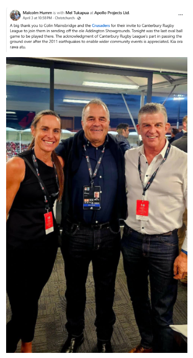The Crusaders took on Fiji Drua in their last home game before taking up residence at Te Kaha (One New Zealand Stadium) in Christchurch City Central. Canterbury Rugby League CEO Malcolm and CRL Board member Mel Tukapua attended the match as guests of Crusaders CEO Colin Mainsbridge.