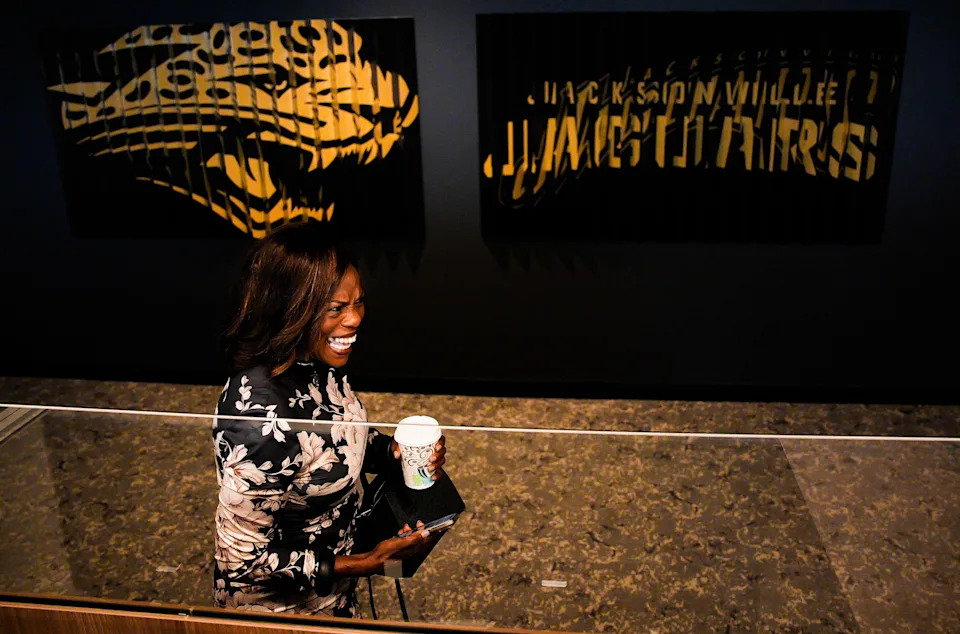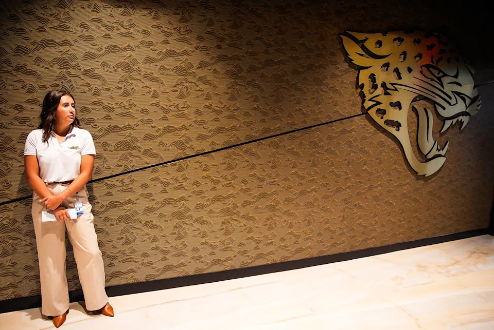 Celestine Mille, executive assistant to Councilwoman Pittman, makes her way by a Jaguars logo in the Jacksonville Jaguars’ newly opened business operations office at One Tower Court, Wednesday March 25, 2026 in downtown Jacksonville, Fla. [Doug Engle/Florida Times-Union]