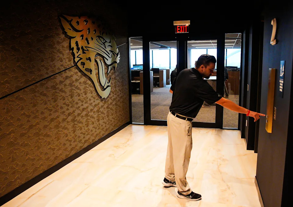 Jaguars Steven Shotola, IT/AV Support Coordinator, takes the elevator from the second floor in the Jacksonville Jaguars newly opened business operations office at One Tower Court, Wednesday March 25, 2026 during a grand opening. [Doug Engle/Florida Times-Union]