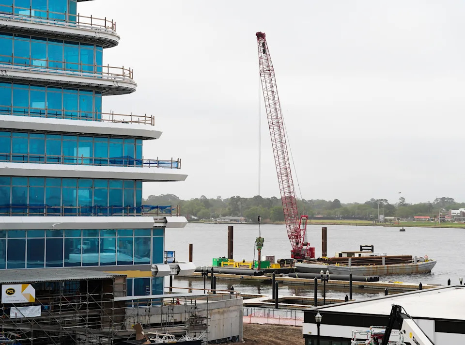 Heavy construction equipment sits on a dock in the Jacksonville Shipyards where the marina will be located adjacent to the Four Seasons Hotel and Jacksonville Jaguars’ newly opened business operations office at One Tower Court, Wednesday March 25, 2026. [Doug Engle/Florida Times-Union]