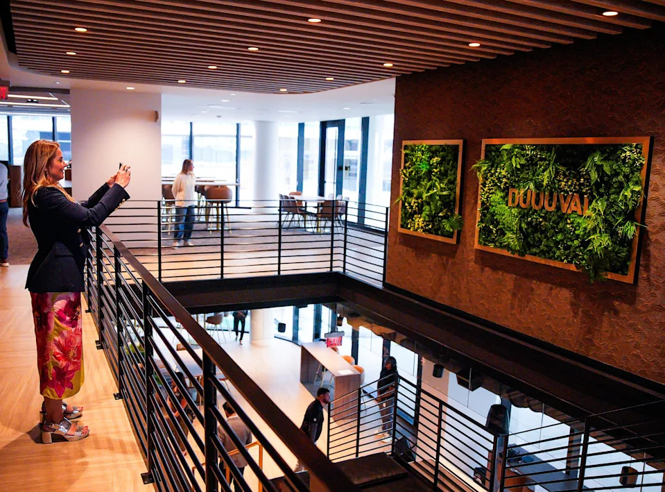 Olivia Frick takes a picture of the “Duuval” saying, framed on a wall in the stairwell to the third floor in the Jacksonville Jaguars’ newly opened business operations office at One Tower Court, Wednesday March 25, 2026. [Doug Engle/Florida Times-Union]