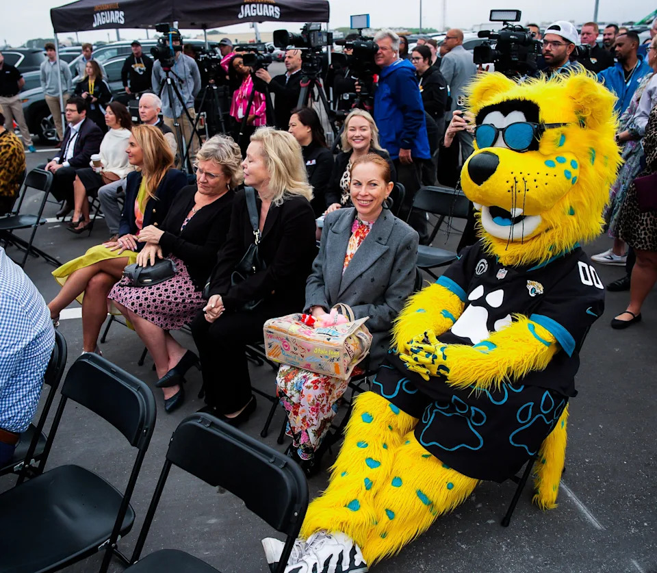 Heather Schatz, second from right, glances over to Jaxson de Ville, the official mascot for the NFL’s Jacksonville Jaguars, as he sat next to her during the grand opening and ribbon cutting ceremony for the Jacksonville Jaguars’ newly opened business operations office at One Tower Court, Wednesday March 25, 2026. [Doug Engle/Florida Times-Union]