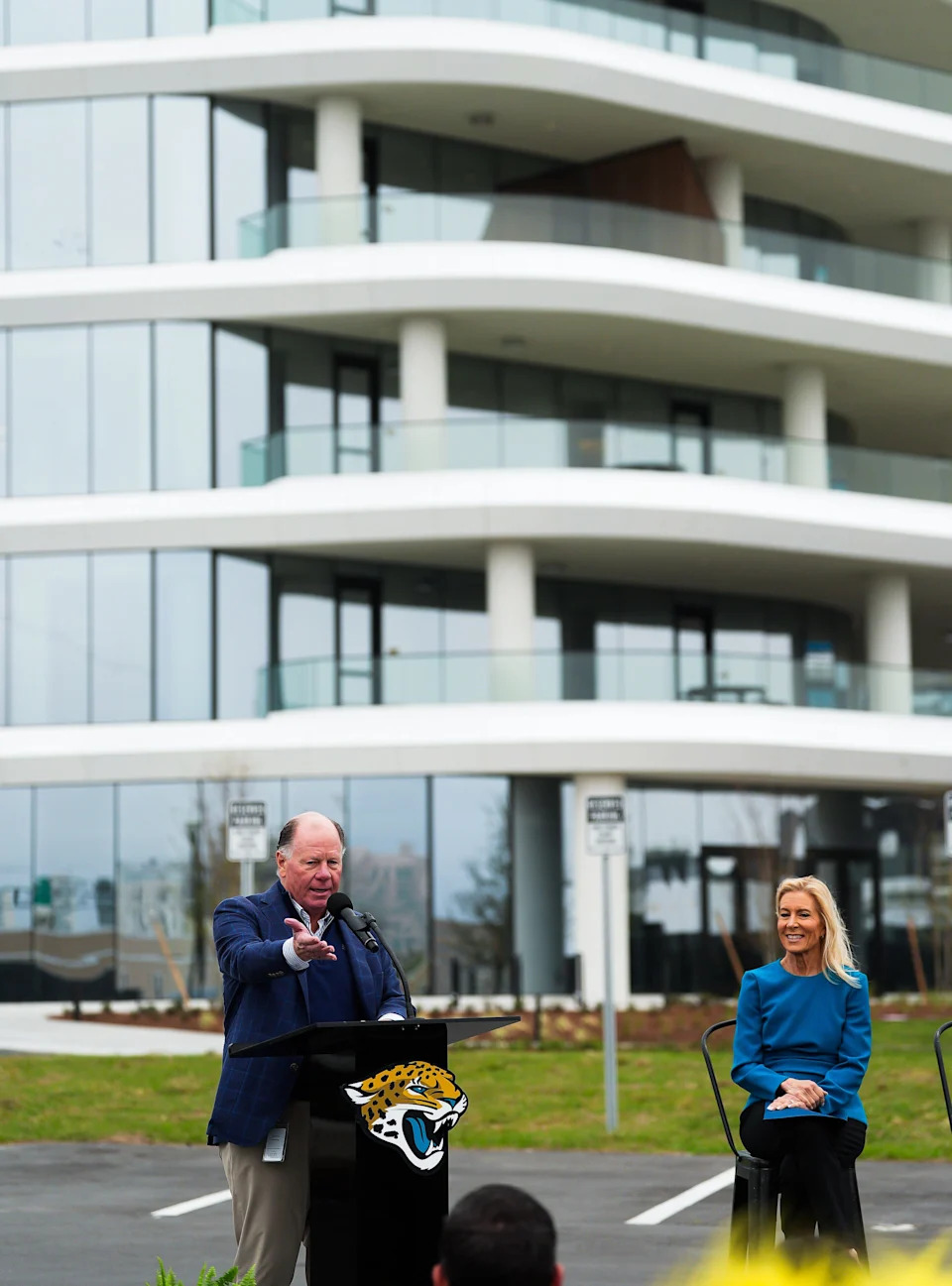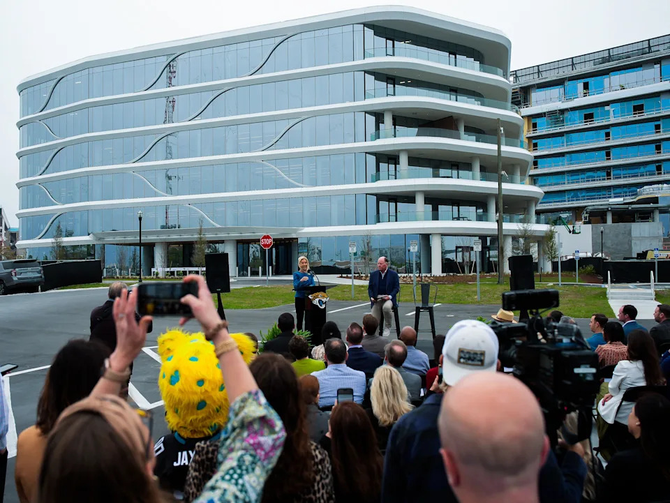 The Jacksonville Jaguars opened their business operations office at One Tower Court, Wednesday March 25, 2026, foreground, with a grand opening and ribbon cutting ceremony. [Doug Engle/Florida Times-Union]