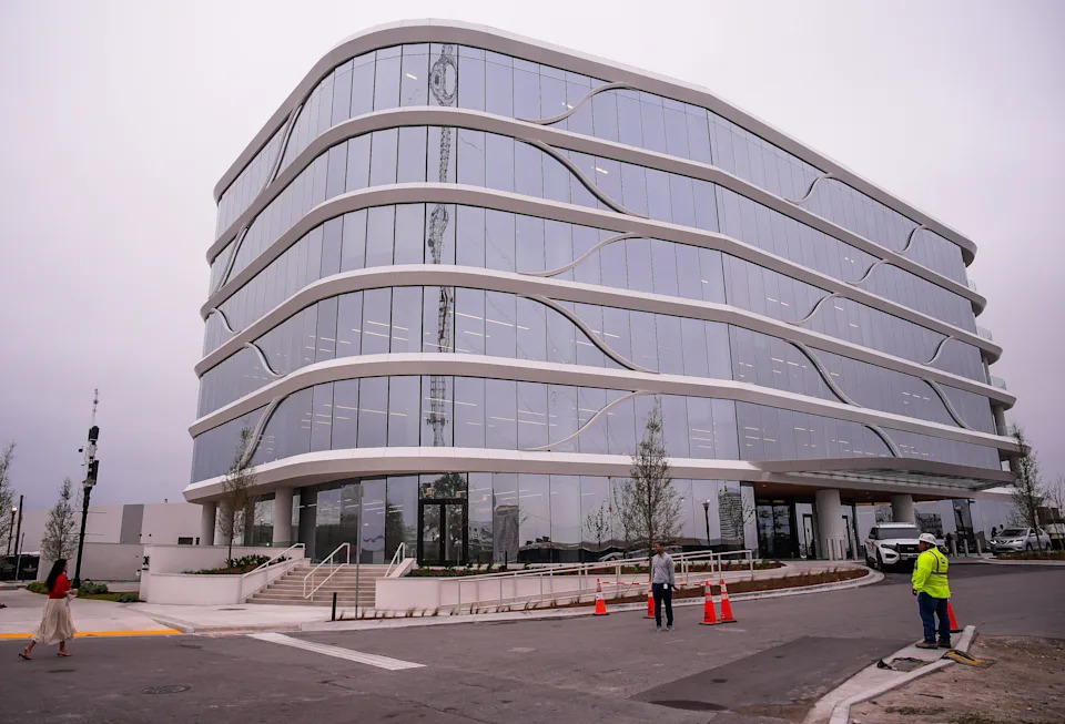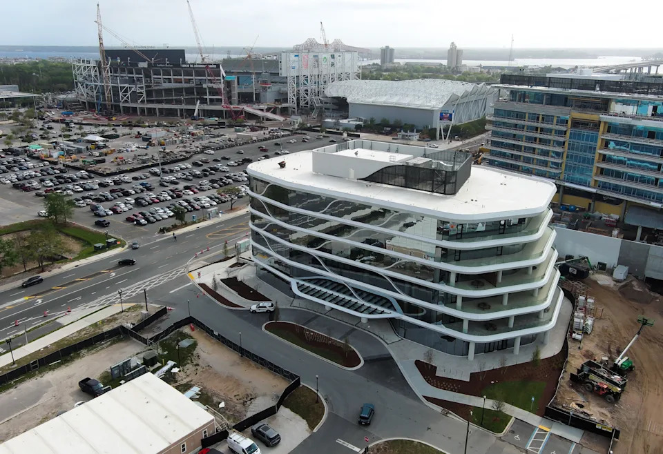 The Jacksonville Jaguars opened their business operations office at One Tower Court, Wednesday March 25, 2026, left. The Jaguars’ 75,287-square-foot business operations occupy the building’s second through fourth floors. The Four Seasons Hotel, right, is still under construction. [Doug Engle/Florida Times-Union]