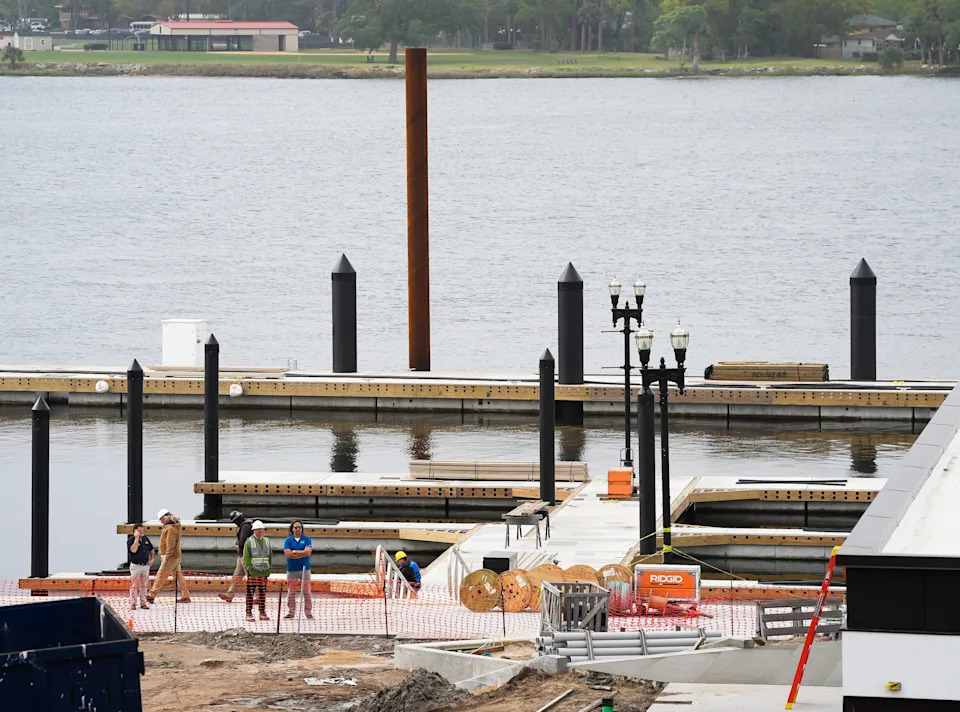 Construction workers stand in the Jacksonville Shipyards near where the marina will be located adjacent to the Four Seasons Hotel and Jacksonville Jaguars’ newly opened business operations office at One Tower Court, Wednesday March 25, 2026. [Doug Engle/Florida Times-Union]