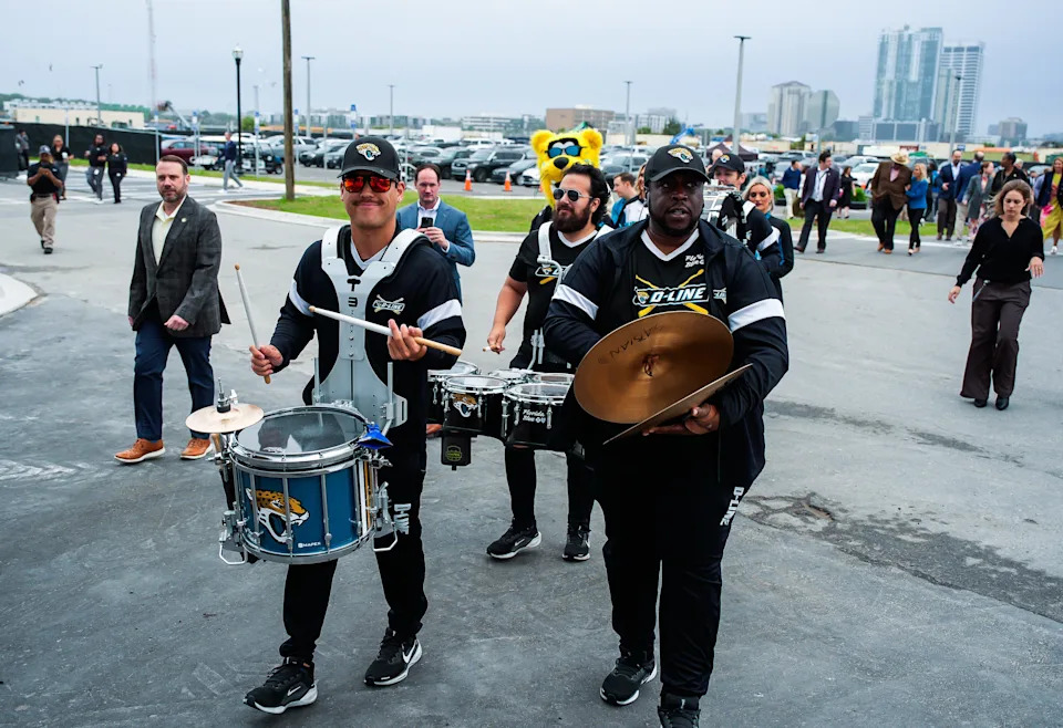 Member of the The Jags D-Line, the official drumline of the Jacksonville Jaguars, escorted people to the ribbon cutting for the Jacksonville Jaguars’ new business operations office at One Tower Court, Wednesday March 25, 2026. [Doug Engle/Florida Times-Union]