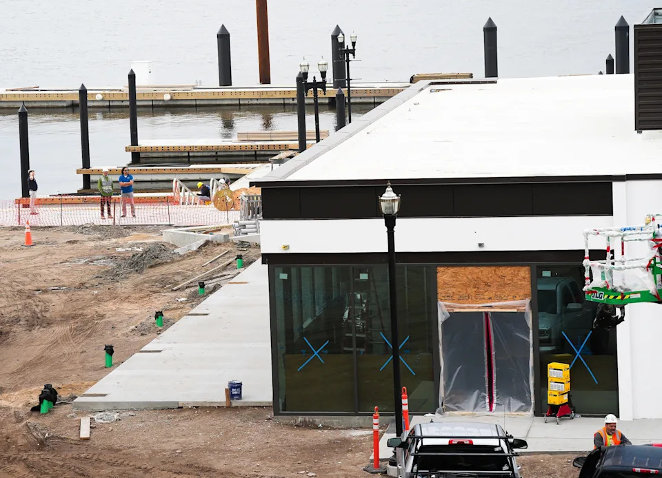 Construction workers look on at the restaurant Asado Life, a Argentinian live-fire restaurant that is opening in August 2026. It is located at the Jacksonville Shipyards marina, adjacent to the Four Seasons Hotel and Jacksonville Jaguars’ newly opened business operations office at One Tower Court, Wednesday March 25, 2026. [Doug Engle/Florida Times-Union]