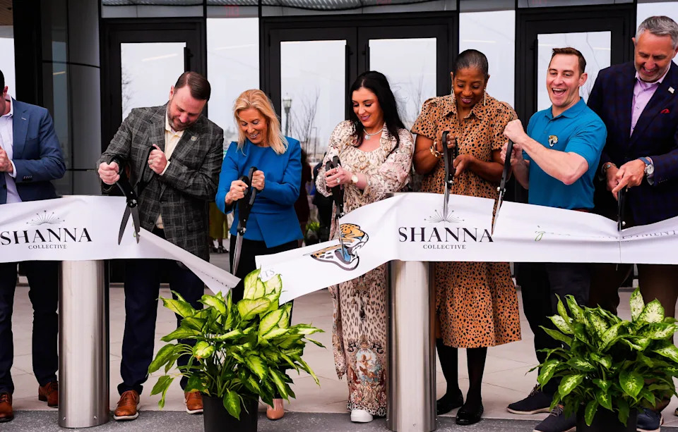 Jacksonville Councilman Joe Carlucci, left, President Kevin Carrico, second from left, all took part in the ribbon cutting festivities along with Jacksonville Mayor Donna Deegan and Shanna Khan, President, Khan Family Office; CEO and Chief Design Officer, Iguana Investments; Founder & CEO, Shanna Collective, third from left and City Council members Tyrona Clark-Murray, Jimmy Peluso and Chris Miller. The Jacksonville Jaguars opened their business operations office at One Tower Court, Wednesday March 25, 2026. The Jaguars’ 75,287-square-foot business operations occupy the building’s second through fourth floors. [Doug Engle/Florida Times-Union]