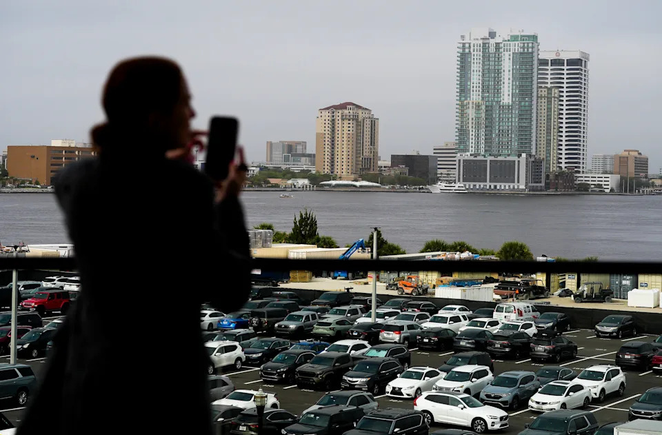Heather Schatz takes a picture of the Jacksonville skyline on the third floor of the Jacksonville Jaguars’ newly opened business operations office at One Tower Court, Wednesday March 25, 2026. [Doug Engle/Florida Times-Union]
