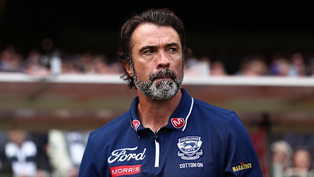 Chris Scott, Senior Coach of the Cats looks on during the AFL Grand Final. via Getty Images