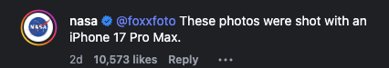 While not mentioned in the post, or on NASA’s website, one commenter on Instagram asked the question about what camera was used, and NASA responded: