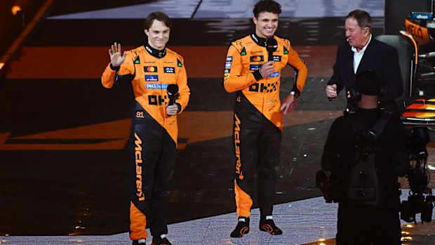 Oscar Piastri and Lando Norris are interviewed by Martin Brundle. Formula 1 via Getty Images