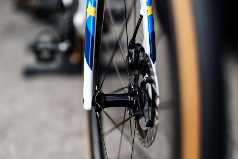 As European champion, Vollering gets to enjoy the Euro stripes around the fork. No such details can be found on the hub, on the other hand.