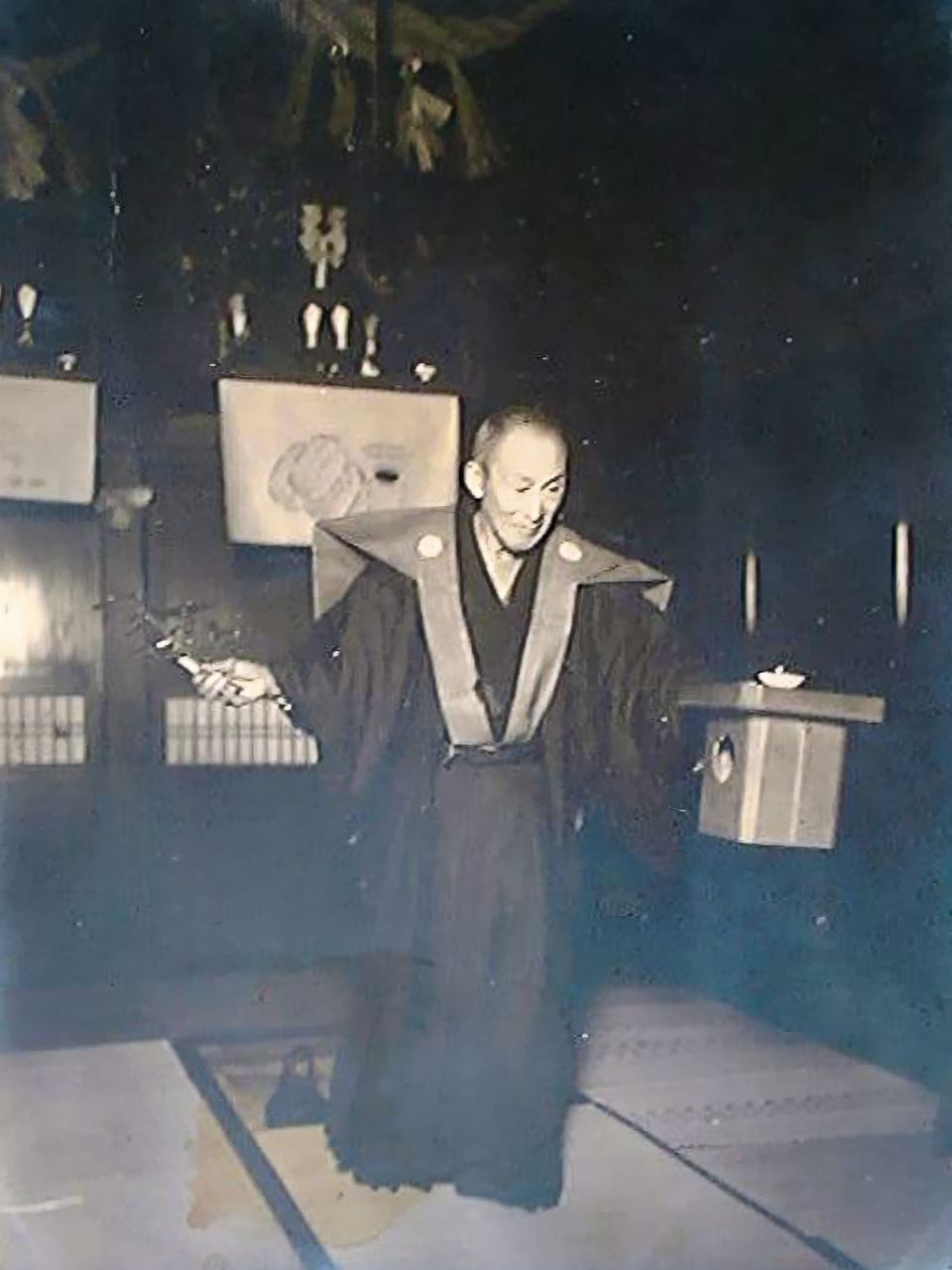 Around the time of the Niiname Research Society’s founding, a local folklorist had obtained a photo of aenokoto, which shows an older man in a kamishimo, a kind of formalwear sleeveless jacket worn over kimono, offering a ritual prayer. That was the first photo Yanagita had ever seen of aenokoto, and it was repeatedly used in publications issued by the folklore research society he headed.