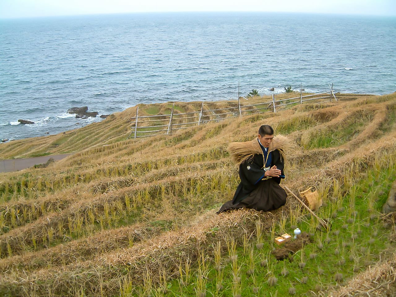 Welcoming the tanokami to Senmaida in 2002. The slope was heavily damaged in the 2024 earthquake, and restoration work is ongoing. (© Kikuchi Akira)