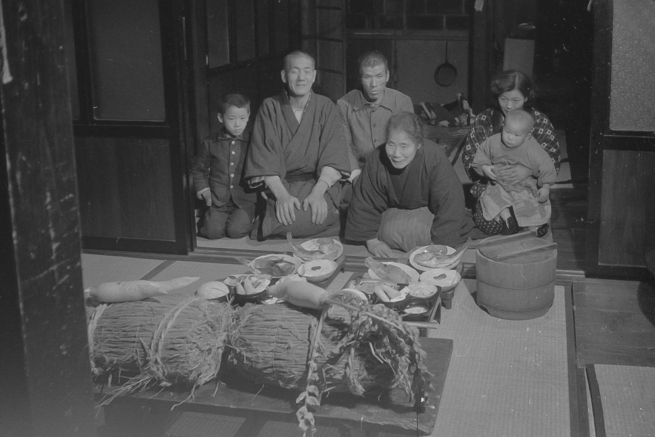 A family offers food and drink to the tanokami, represented here by bales of seed rice and a forked daikon radish. (© Haga Hideo)